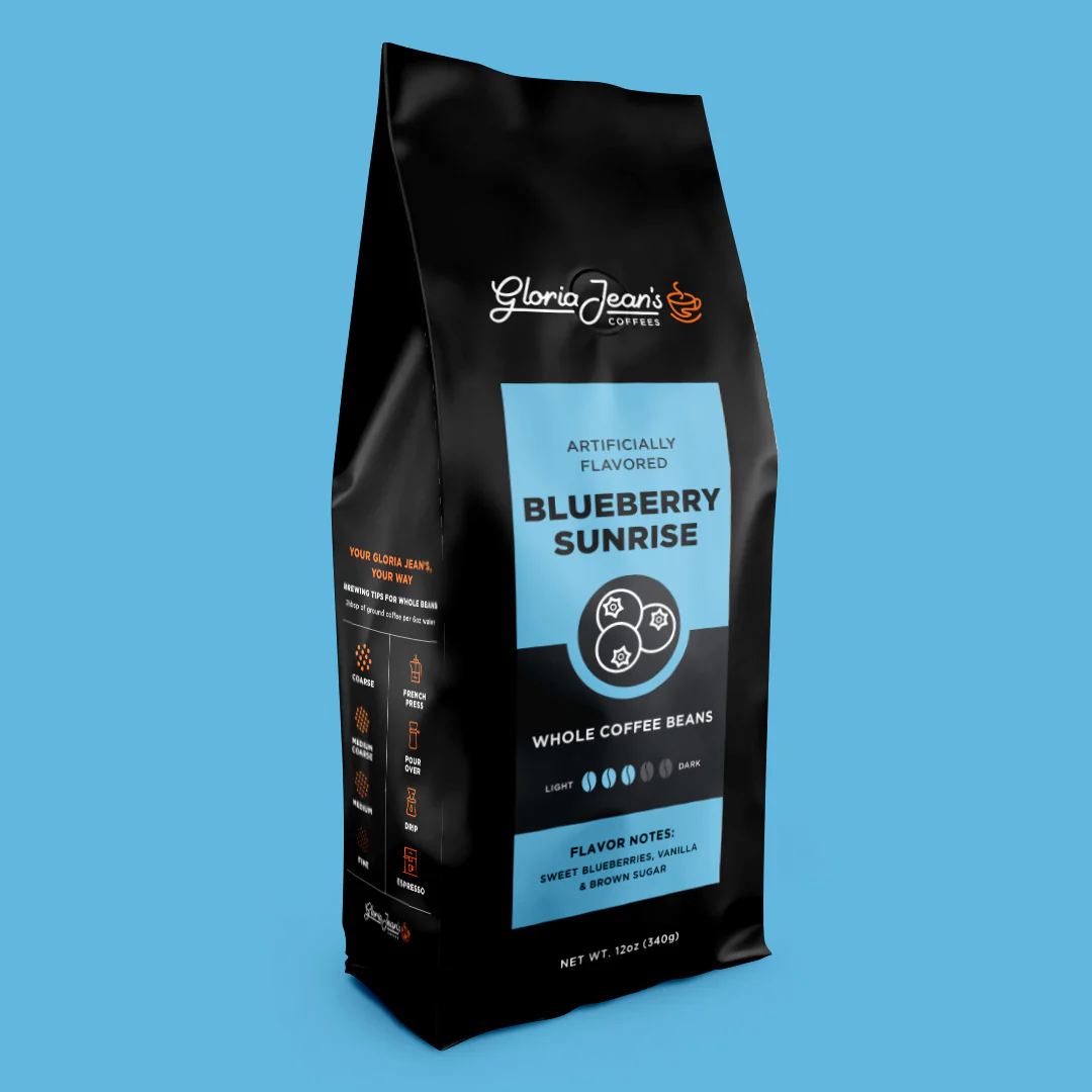 Our Blueberry Sunrise flavored coffee has a fresh blueberry and walnut flavor and aroma. It has a medium body, medium acidity and smooth finish. 100% Arabica coffee beans.
